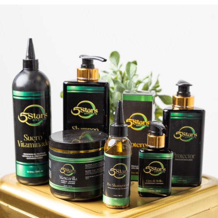Nuestro kit de 5 pasos son a base de jengibre, canela, romero, verbena y biotin, entre otros, principalmente ayuda a detener la caída y el progreso del crecimiento del cabello.